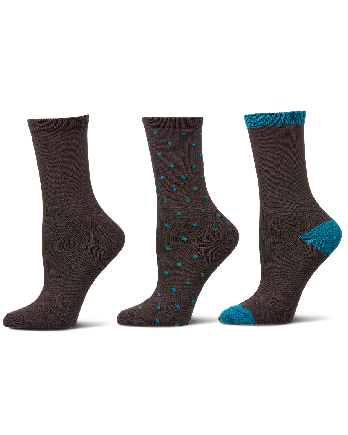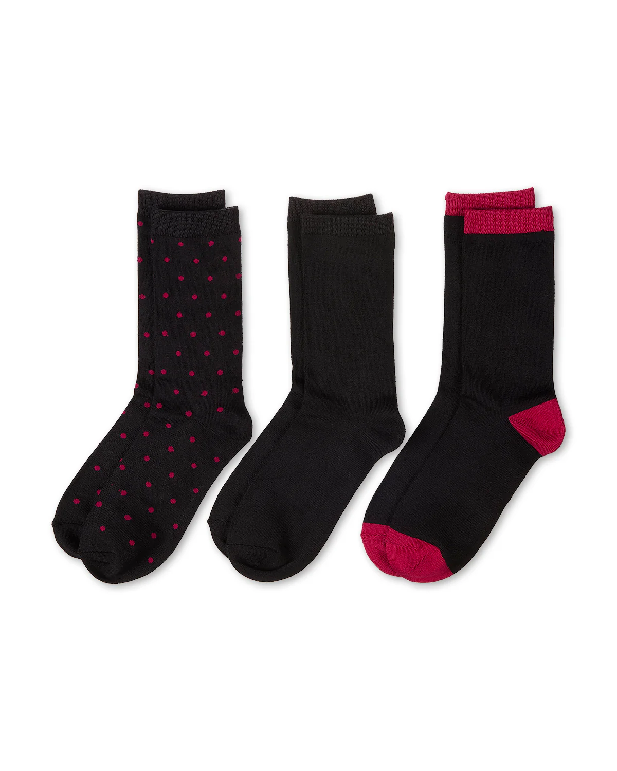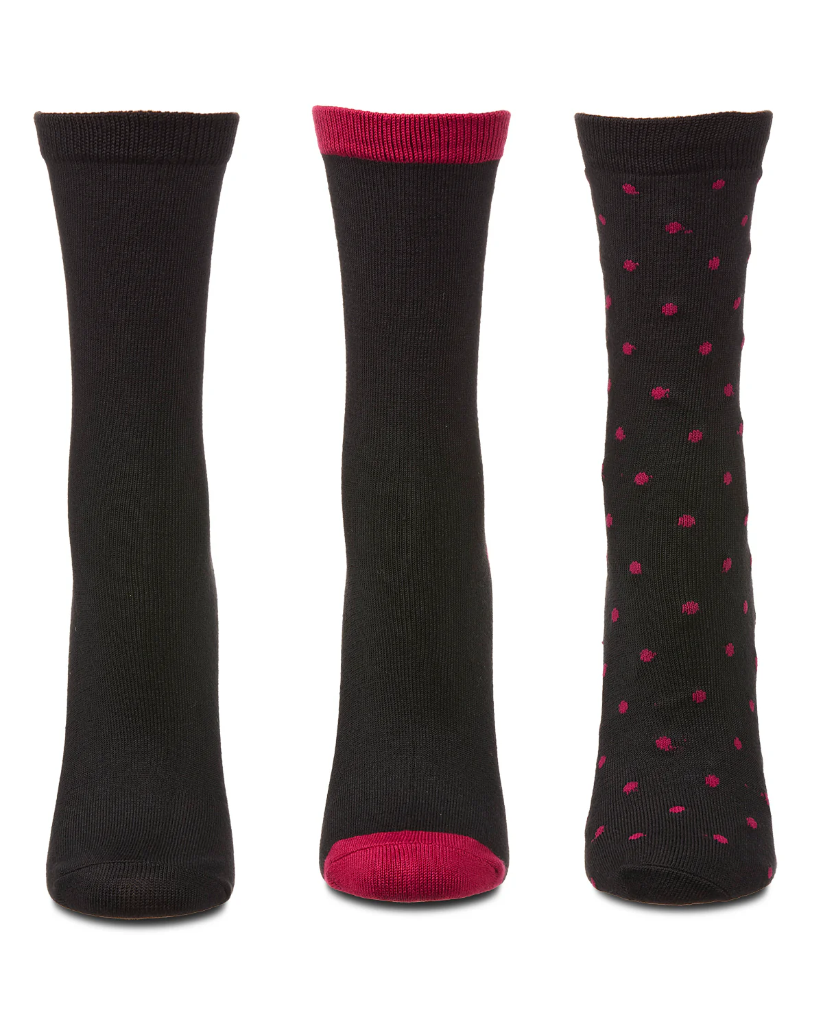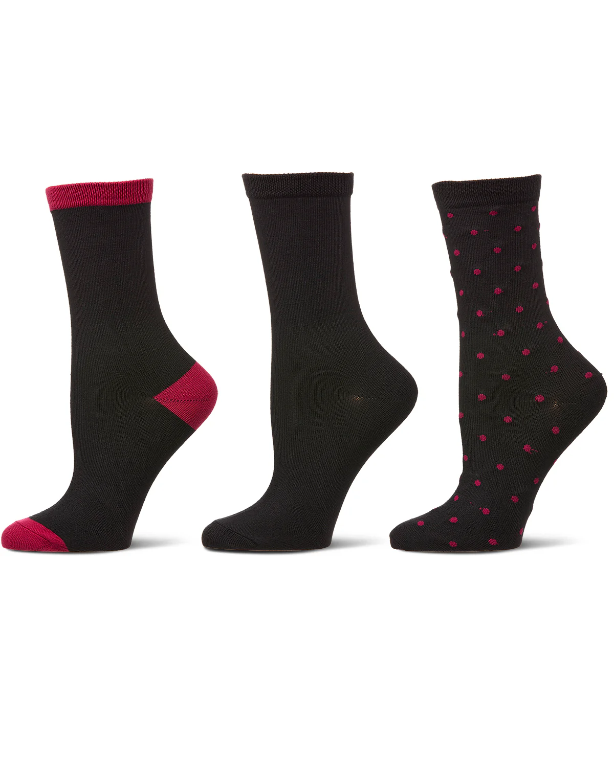 Enjoy blissful all-day comfort with these buttery-soft women’s socks. Each convenient 3-pack provides 3 premium pairs of elegant fine-gauge socks, all carefully crafted with luxe moisture-wicking yarns. One pair has cute knit-in polka dots. Another boasts chic contrast trim. And the third is solid all over. Great gift or stocking stuffer.