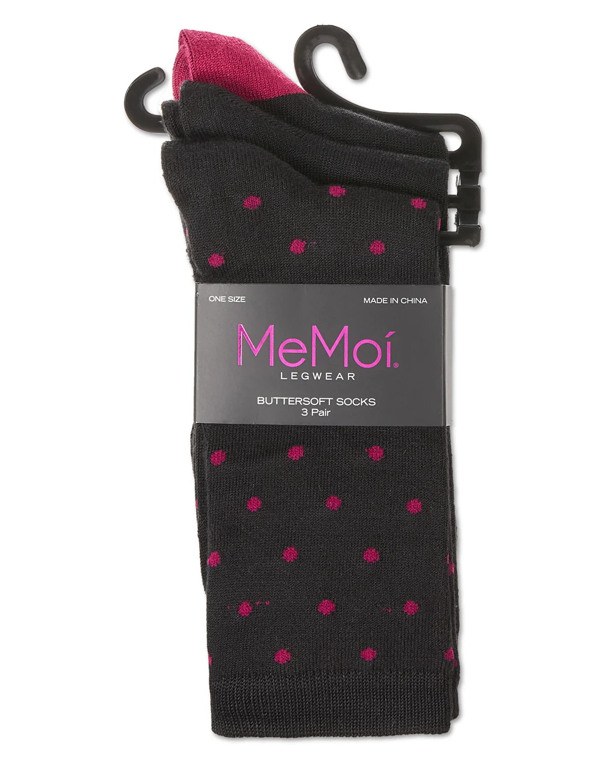3 Pairs Women’s ButterSoft Polytam Polka Dot and Solid Colors Crew Socks