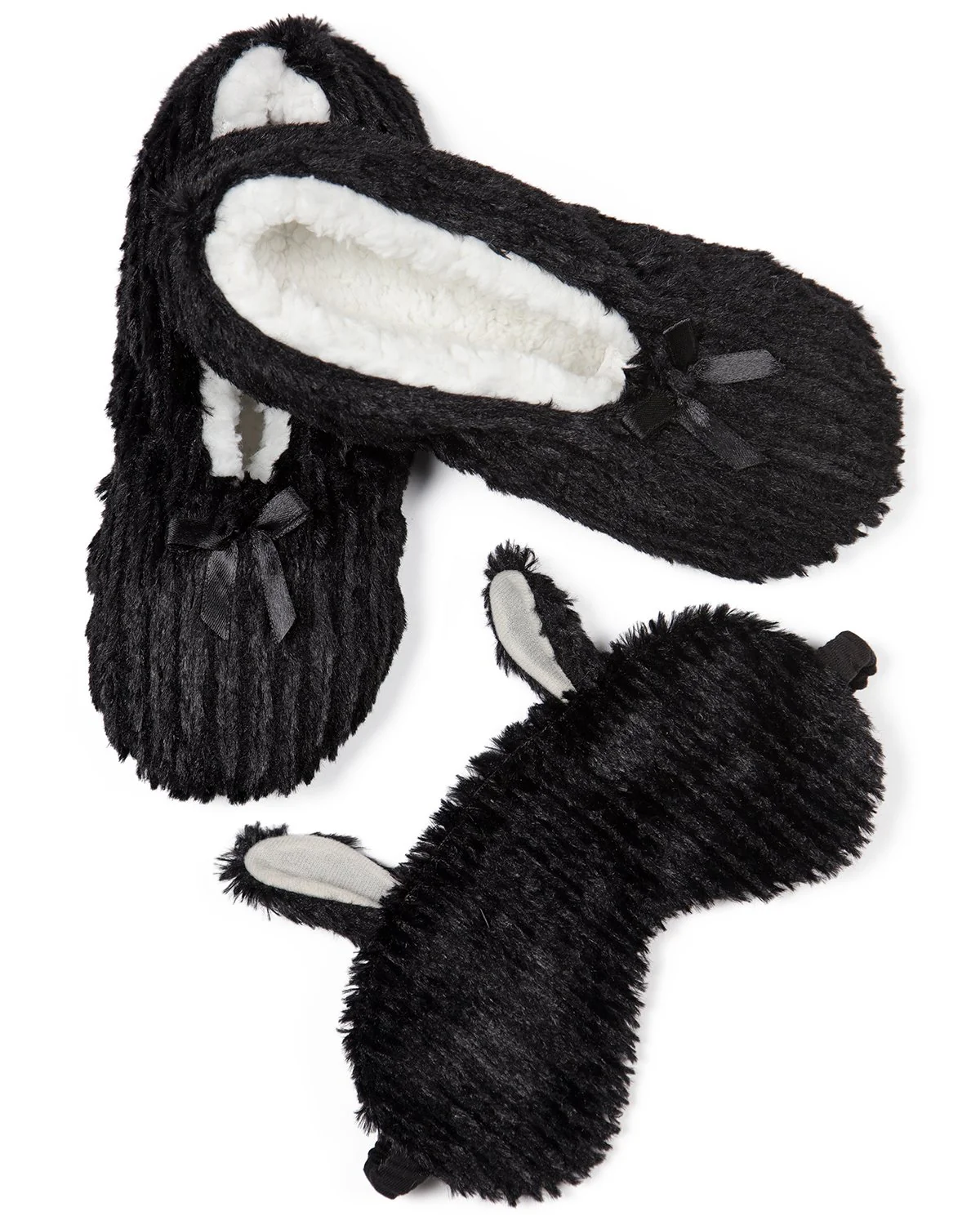 Get your claws into MeMoi Cuddly Critter Eye Mask & Slipper Set – the ultimate gift for the animal lover in your life. Our two-piece jet-black fur set features a supremely plush low-cut bootie with an equally soft lining. The eye mask resembles a pair of sleek, cat ears and comes with a stretchy band to go around your head comfortably.