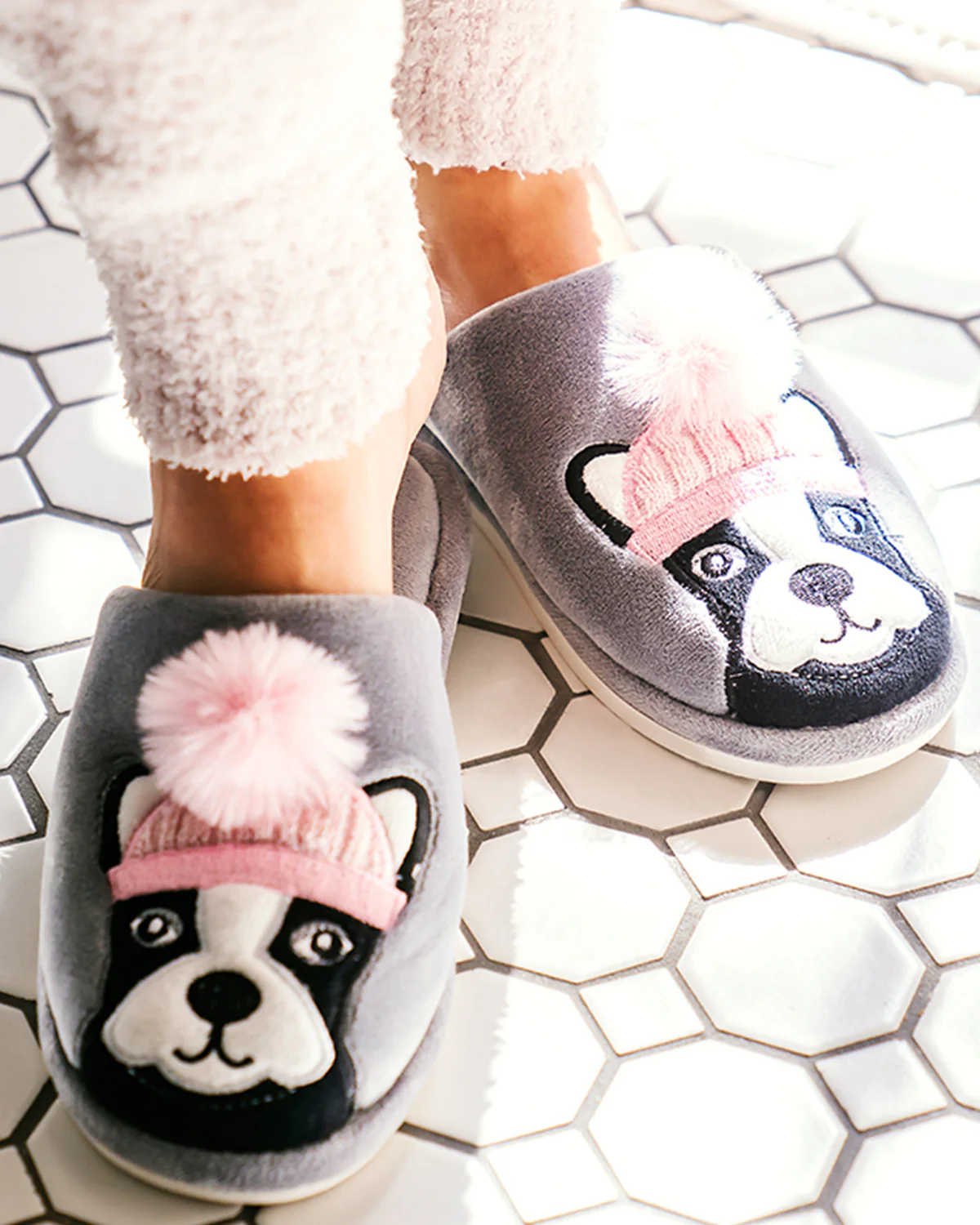 The perfect slippers for when your dogs are barking. Our Dog Dame Plush Slippers are designed for super-soft comfort from heel to toe. An adorable applique puppy adorns the front, dressed for cold weather in a cap with a ruffled pompom accent.