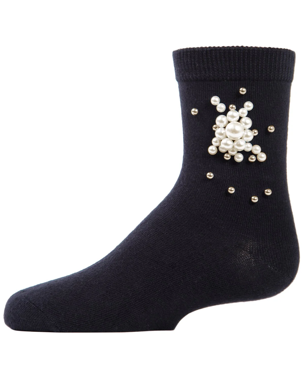 Feathery Combed Cotton Faux Pearl Girls Crew Socks