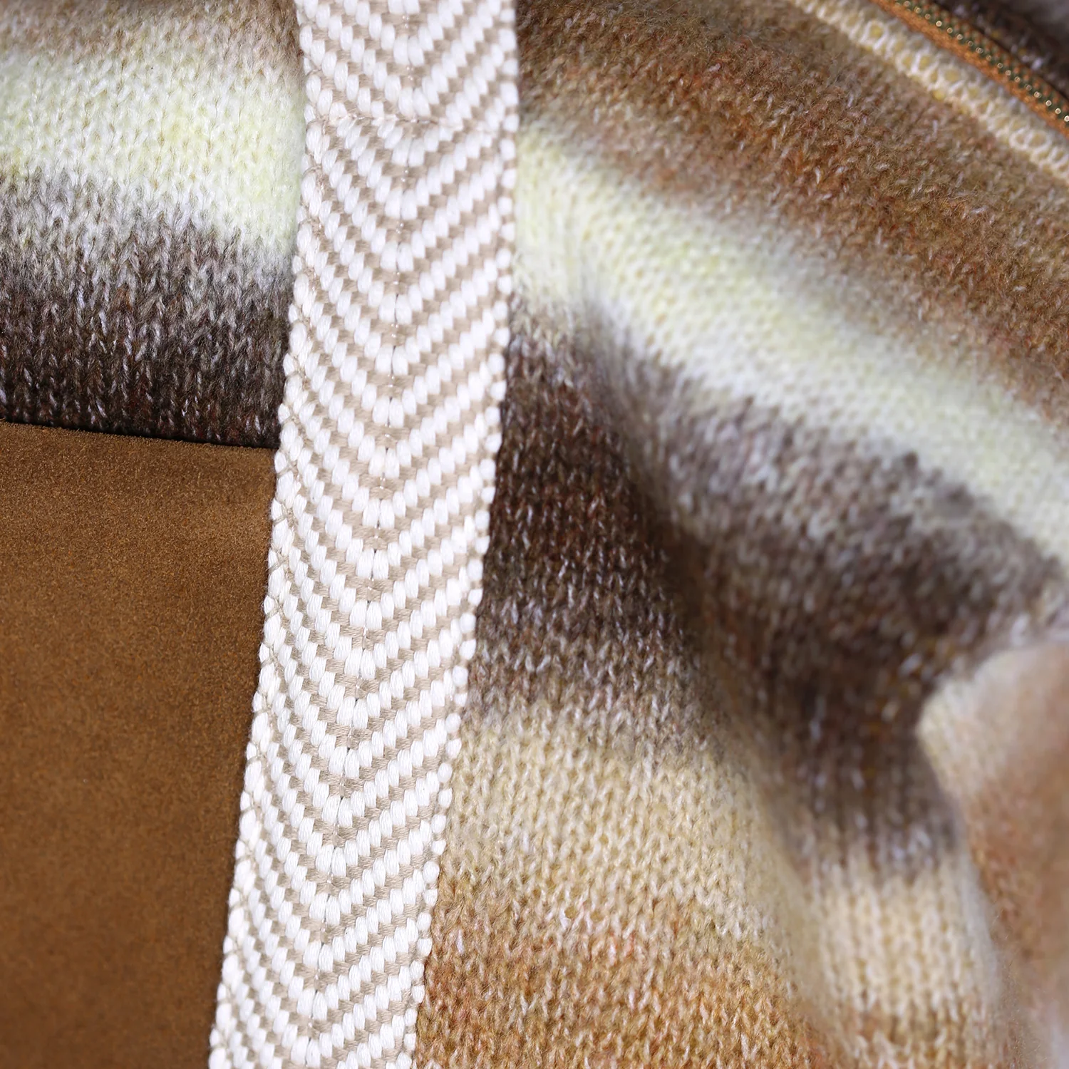 Le tissu est rehaussé par une poche avant plaquée, ainsi qu’un fond en cuir daim Camel, et des poignées en sangle chevron écru et blanc, pour un look graphique et affirmé.