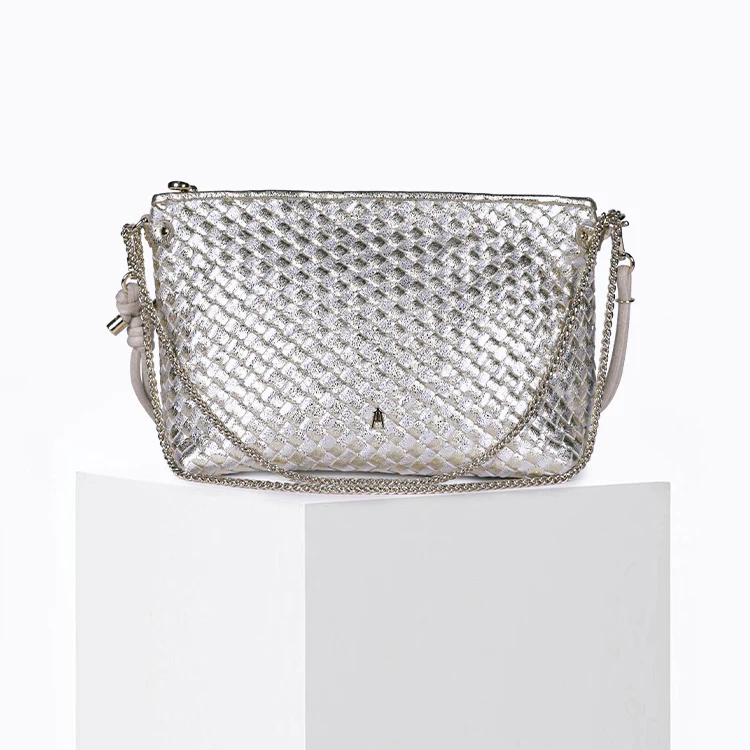 Le Mallow Tressé Argent Or est une version précieuse et raffinée de notre sac iconique. Confectionné en cuir d’agneau argent, il est entièrement tressé à la main à partir de bandellettes de cuir or, selon la technique traditionnelle de l’intrecciato, révélant un savoir-faire artisanal d’exception.