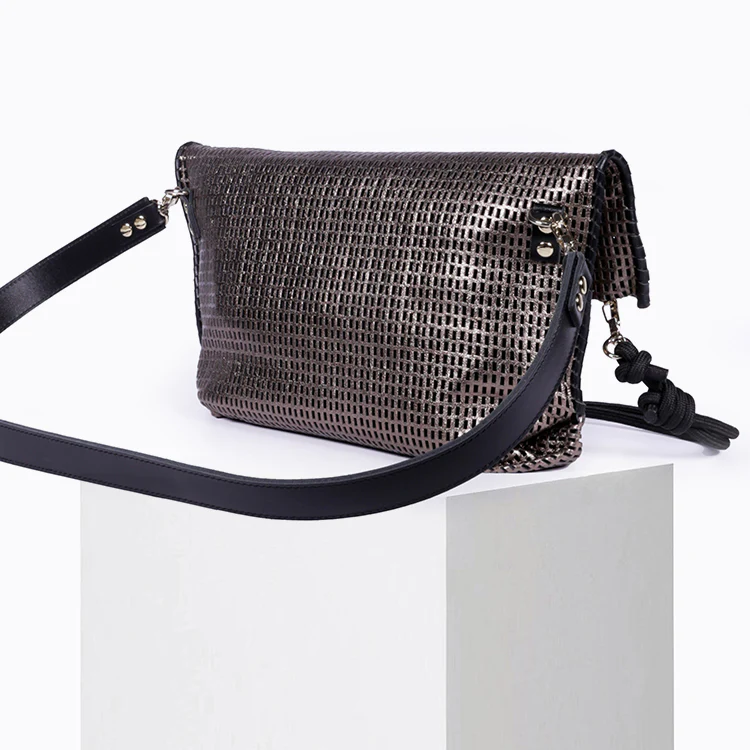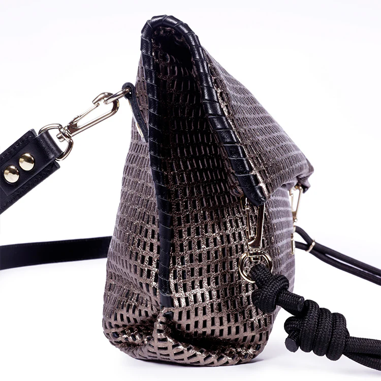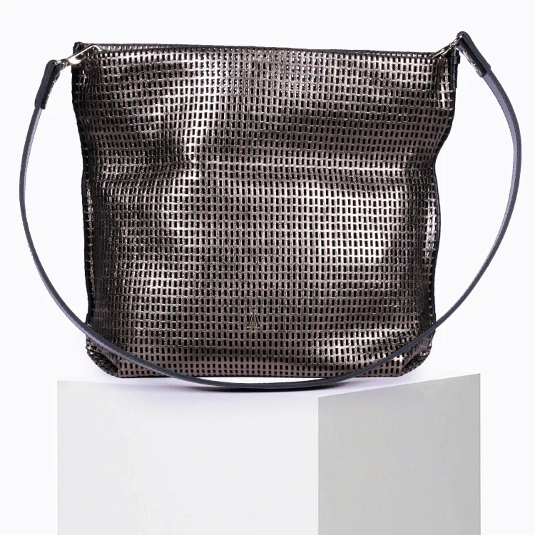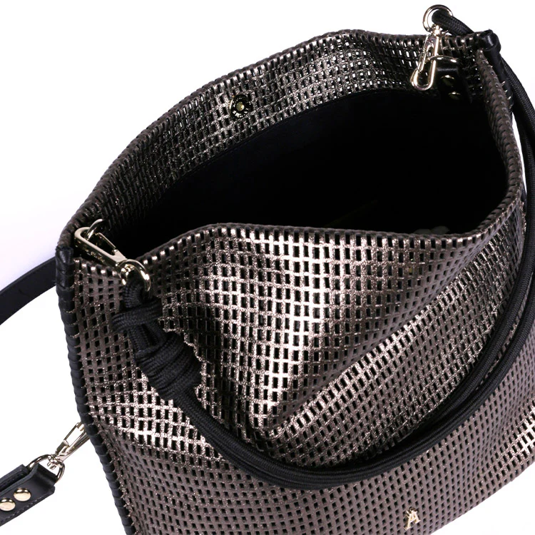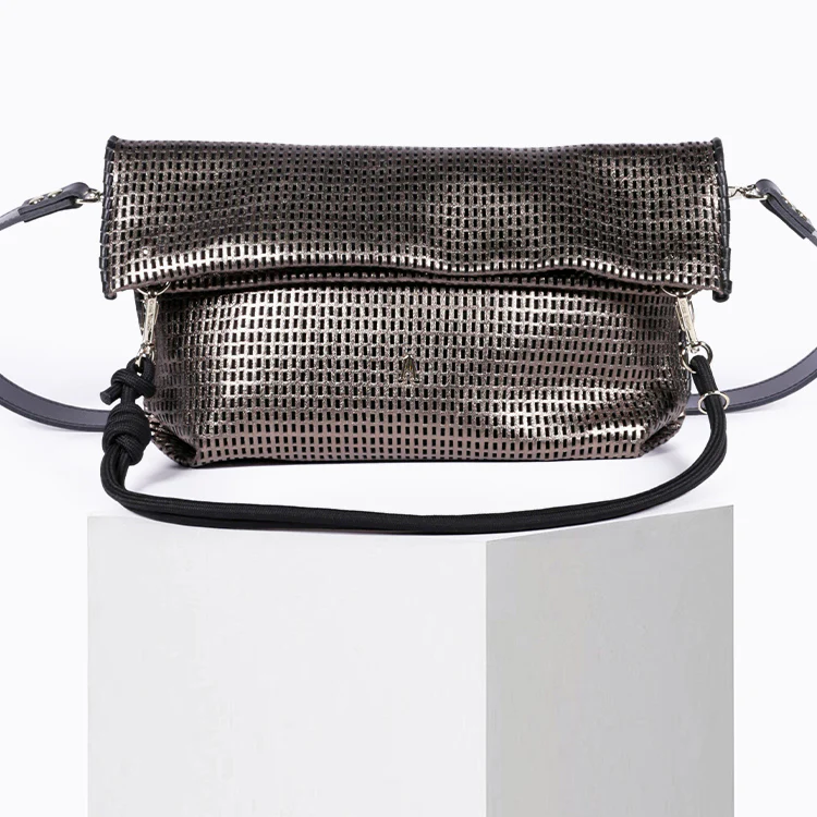 Le sac Mid Perforé Lunar est un modèle original et modulable, conçu en cuir perforé métallisé, assemblé à la main avec un fil de cuir noir. Sa silhouette évolutive permet un porté cabas généreux lorsqu’il est ouvert, ou un format baguette plus compact une fois replié.
