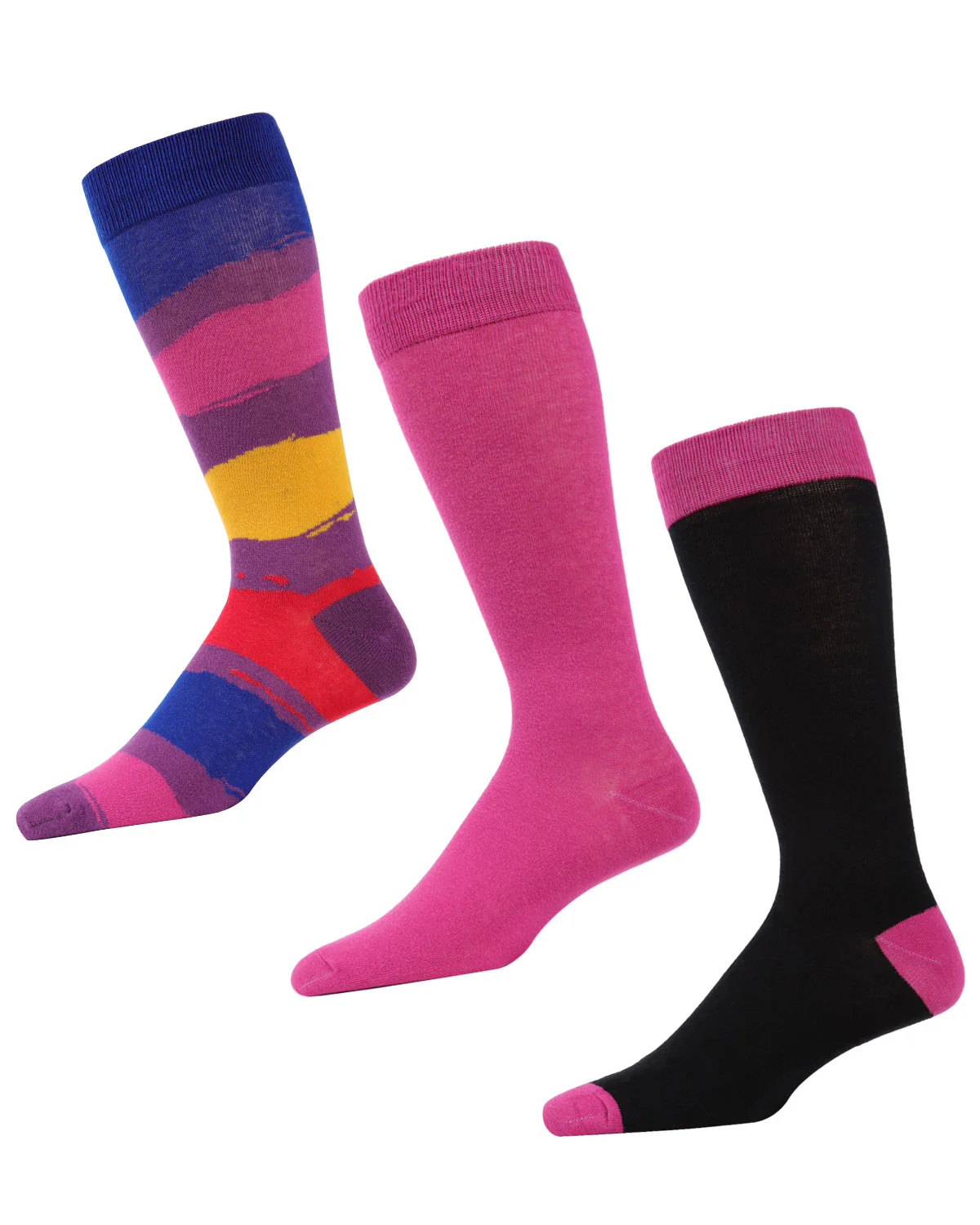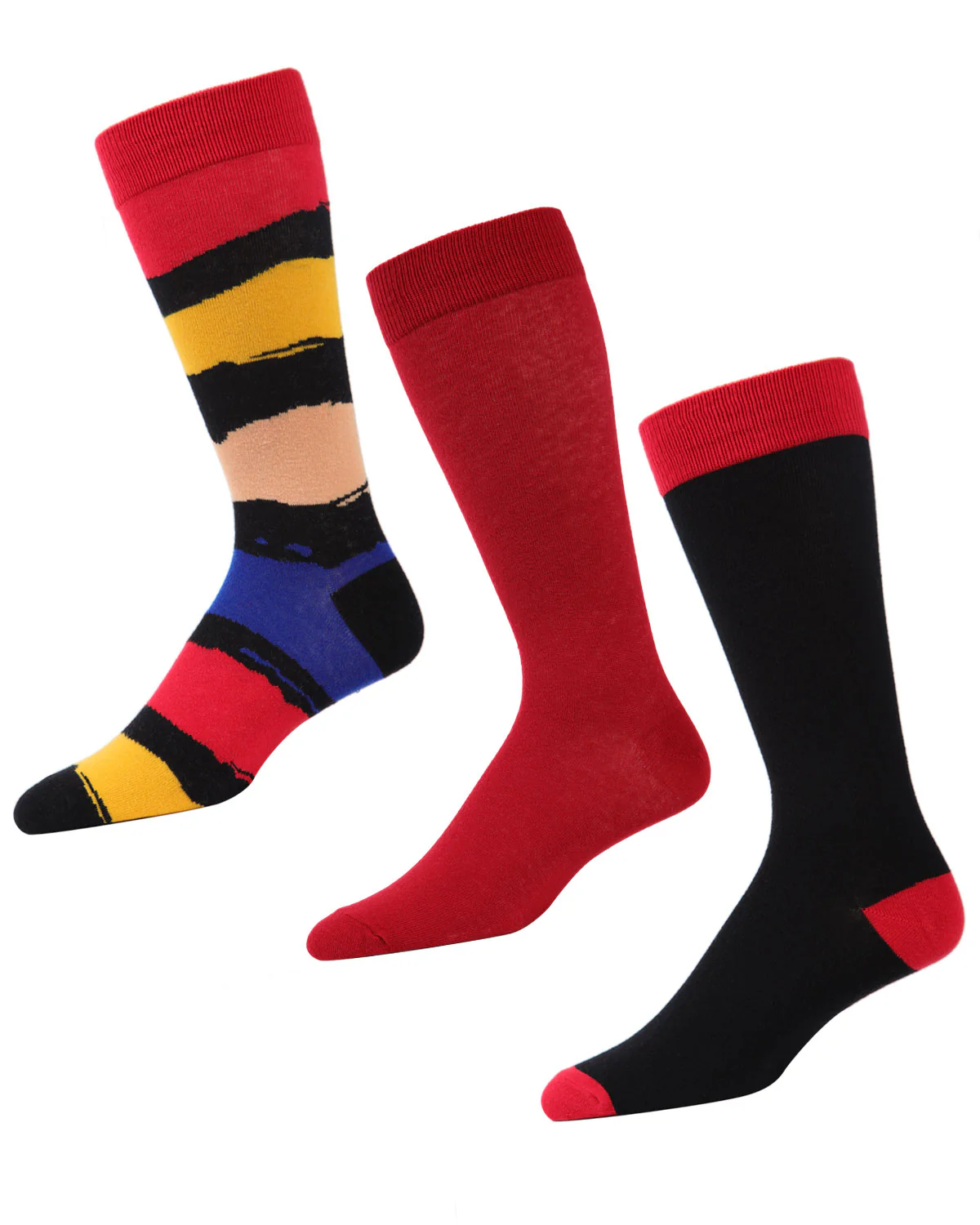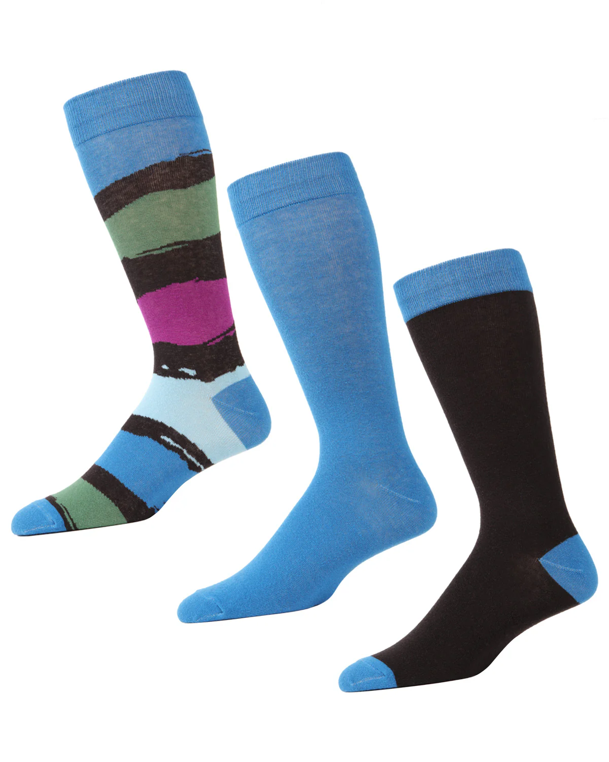 This artistic set of socks are a painter’s – or art appreciator’s – dream come true. 3 dreamy socks come together in our Paint Block Cotton Blend Crew 3 Pack: one sock with an abstract striped pattern, one solid color sock, and one sock with a contrasting heel, toe, and cuff. All are able to be mixed and matched easily. This 3-pack comes in several sets, so if you get all, you have a new collection of socks. Now that’s a work of art.
