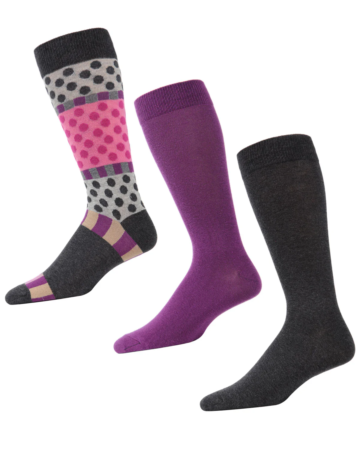 If you just can’t get enough of patterns, be they polka dots, stripes, or blocks of color, our Polka Dash Crew 3 Pack is the set for you. 3 coordinated socks come in this eclectic pack: one sock with multiple patterns of dots/stripes/color blocks and two solidly colored socks. Mixing and matching is encouraged with this pack.