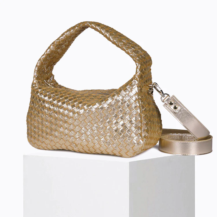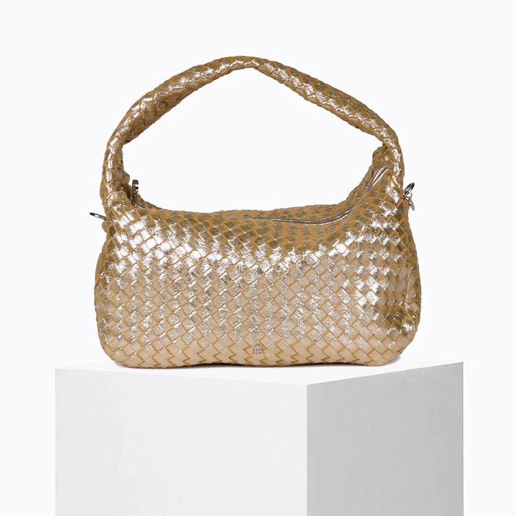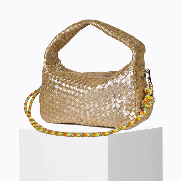 Découvrez le Sac Ballon Tressé Or, une pièce unique et sophistiquée qui allie artisanat et fonctionnalité. Confectionné en cuir d’agneau tressé intrecciato à la main, ce sac se distingue par sa texture artisanale et son coloris doré. La doublure en coton bio offre un intérieur doux et respectueux de l’environnement.
