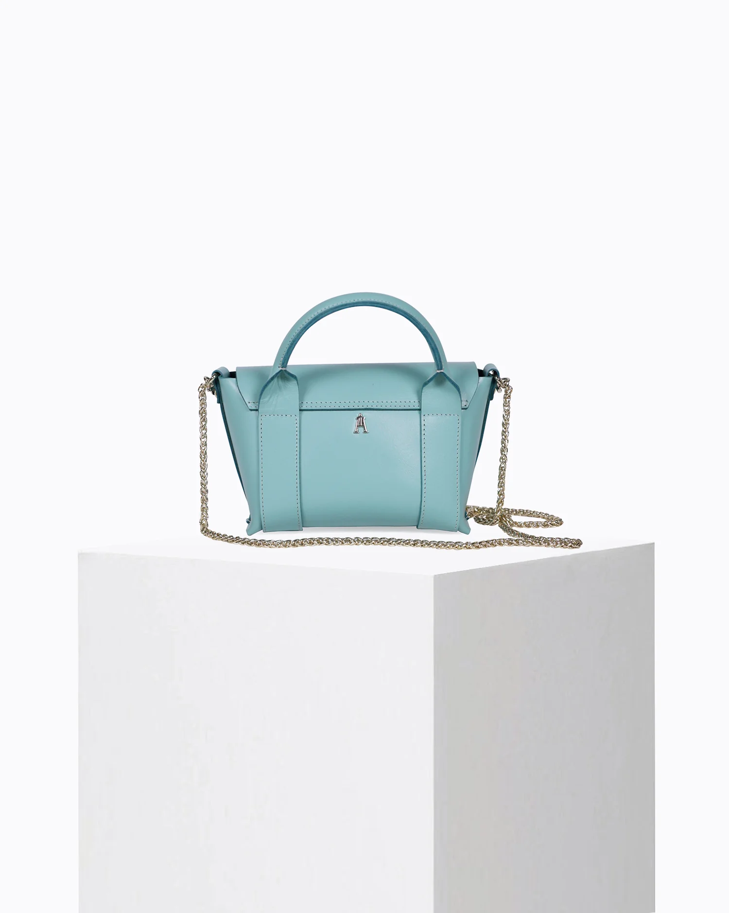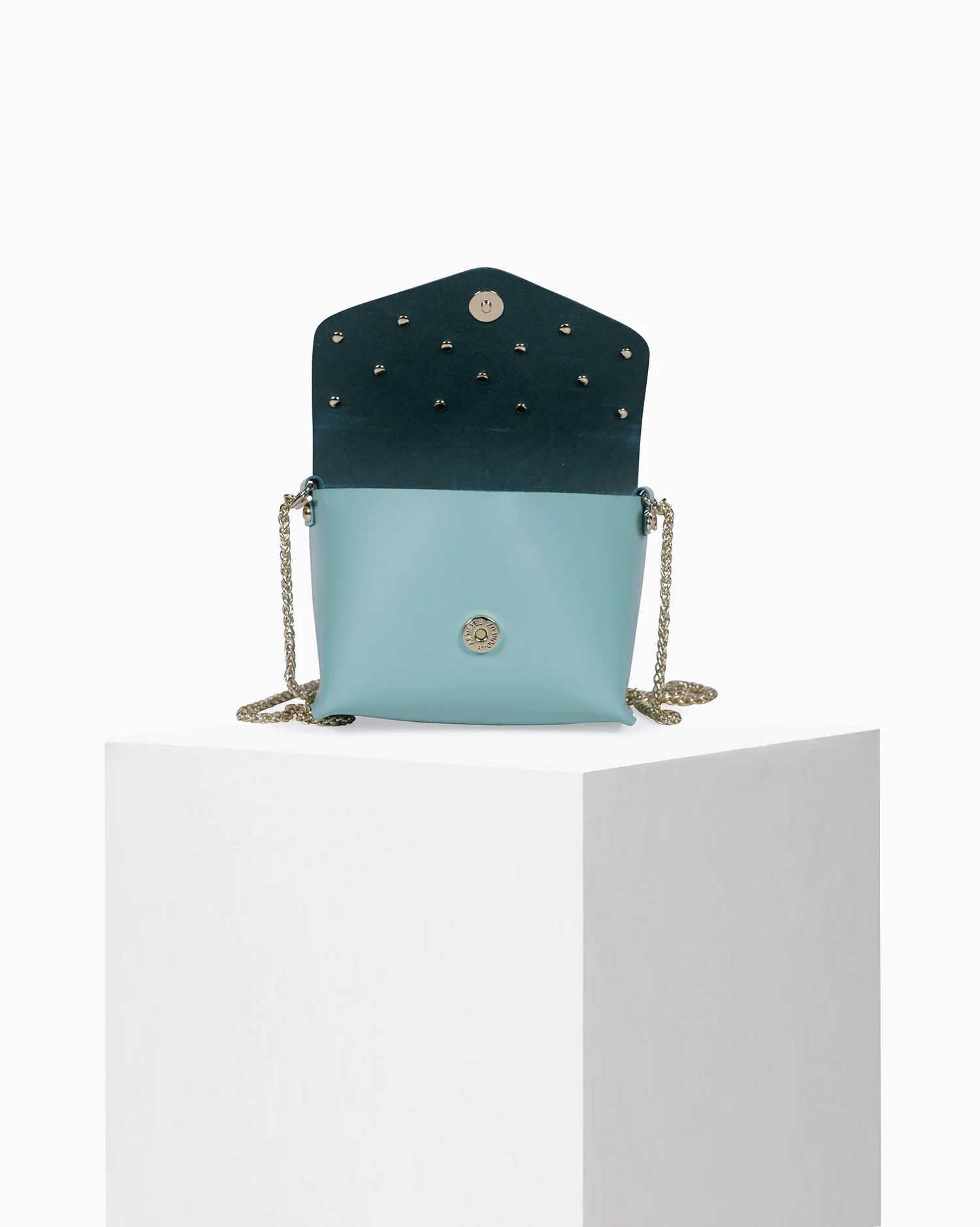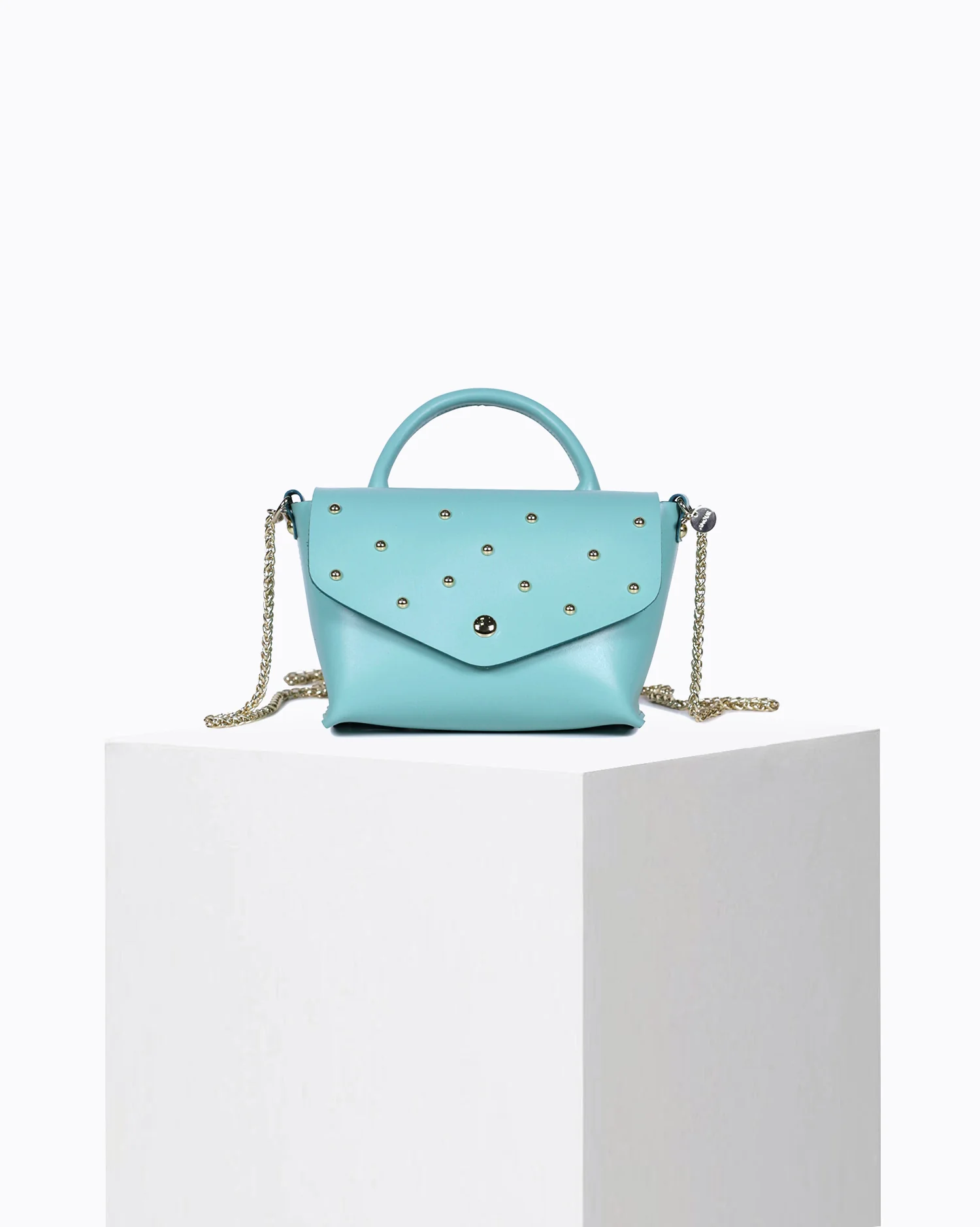 Ecrin Stud Turquoise, le nouveau micro sac femme pensé pour être un bijou à votre bras et accueillir vos essentiels de jour comme de nuit. Minimaliste, on adore cette version exotique en cuir de vachette rigide bleu turquoise avec des bords francs au look très structuré, sur laquelle nous avons placé des rivets de tailles différentes pour une finition contemporaine chic. Portez-le aussi bien à la main avec la poignée ou à votre épaule grâce à la bandoulière chaîne amovible. Il vous donnera une allure folle !