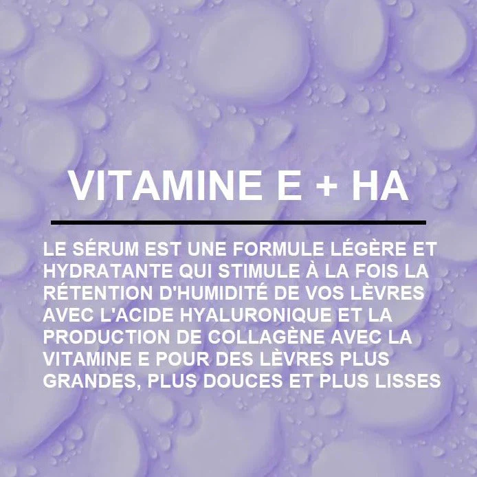 Notre formule, à base de Vitamine E + Acide Hyaluronique, nourrit vos lèvres avec des ingrédients cicatrisants qui hydratent les lèvres et les rendent pulpeuses ! Cette formule est bénéfique pour l’apparence générale des lèvres car la Vitamine E permet aux lèvres de produire du collagène pour des lèvres naturellement plus pulpeuses et l’Acide Hyaluronique augmente la rétention de l’humidité, de sorte que les lèvres restent hydratées et pulpées.