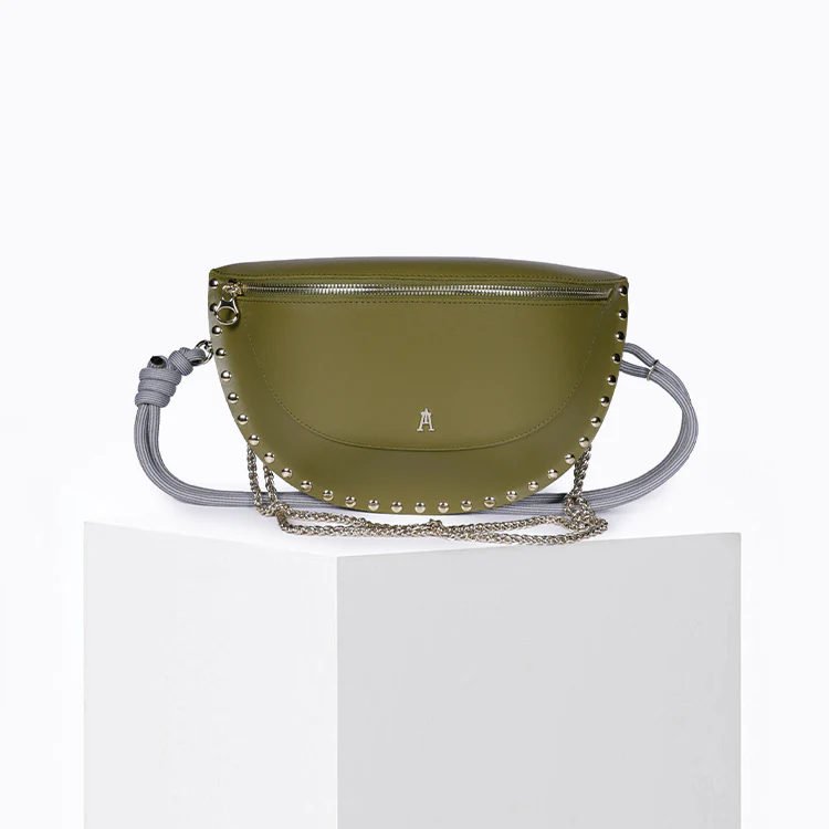 Un sac banane en cuir clouté qui allie style, modularité et modernité, signature de l’univers Craie Studio.