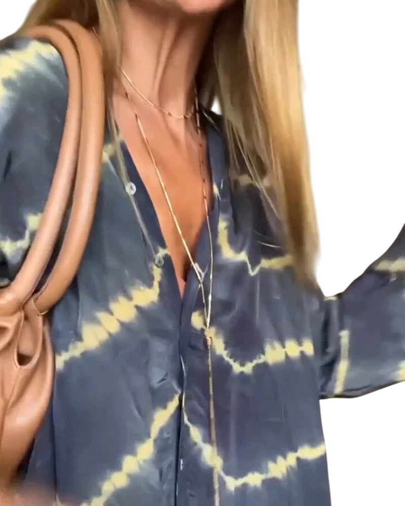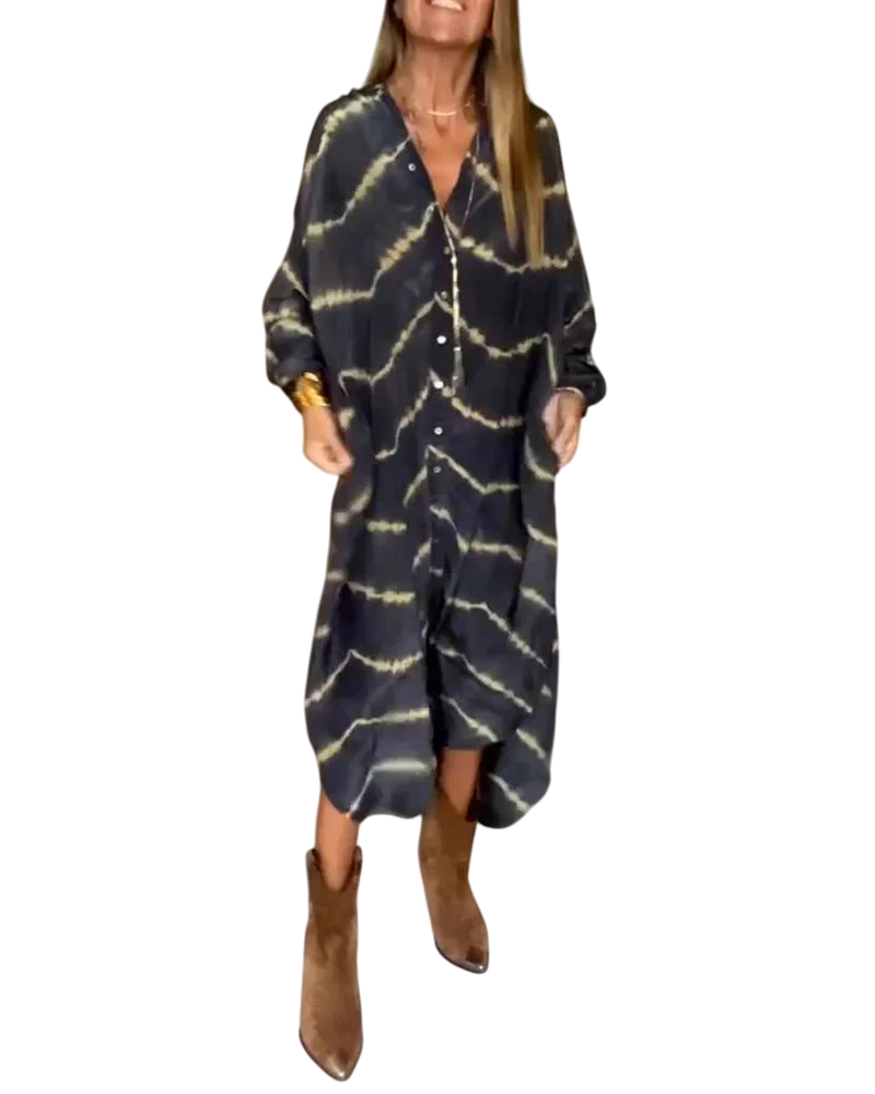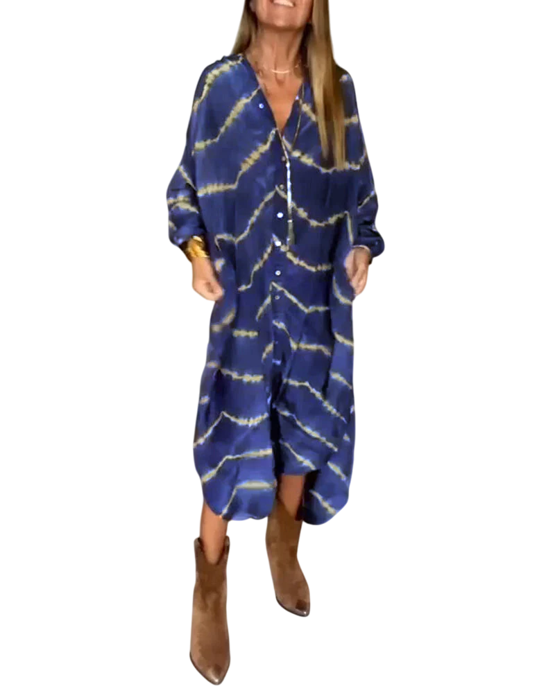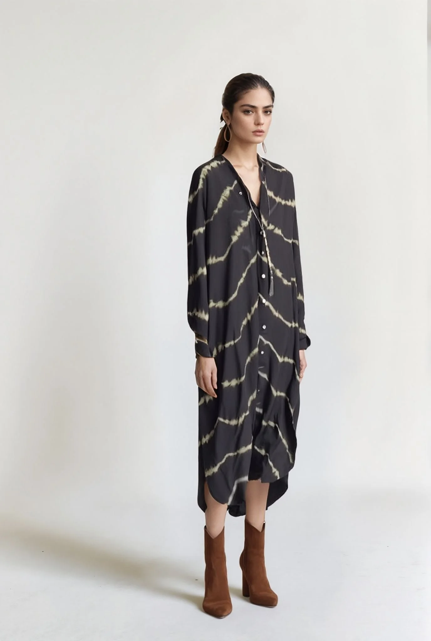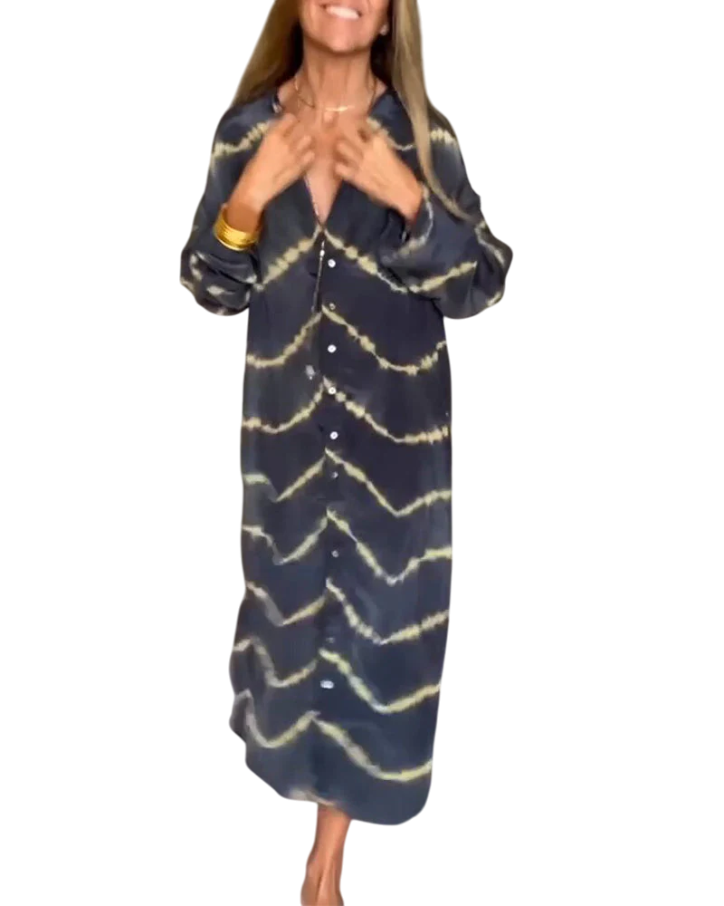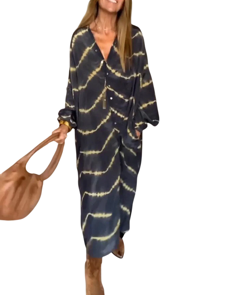 Laissez-vous charmer par la coupe ample et le confort absolu de la robe Stella Azur. Son motif unique tie-dye, jouant sur des contrastes et des nuances, lui confère un caractère artistique et tendance. Confectionnée dans un tissu qui semble merveilleusement fluide, cette pièce mi-longue (ou longue, selon la perception finale) assure une liberté de mouvement et une sensation de légèreté. L’encolure en V, ornée de boutons visibles sur le devant, vous permet de jouer avec votre style, tandis que les manches longues aux poignets lâches accentuent son esprit bohème et décontracté.