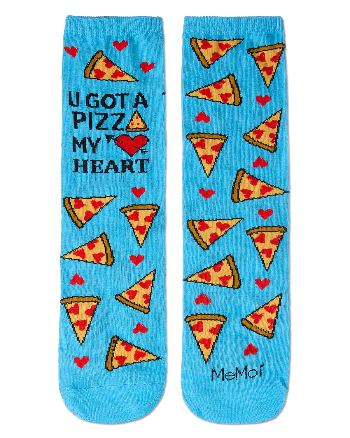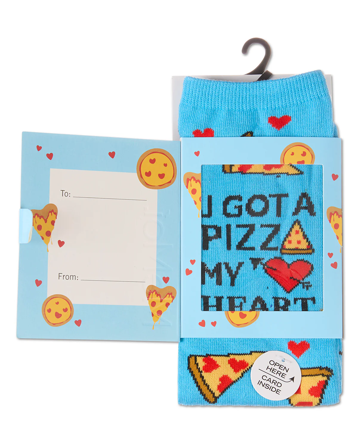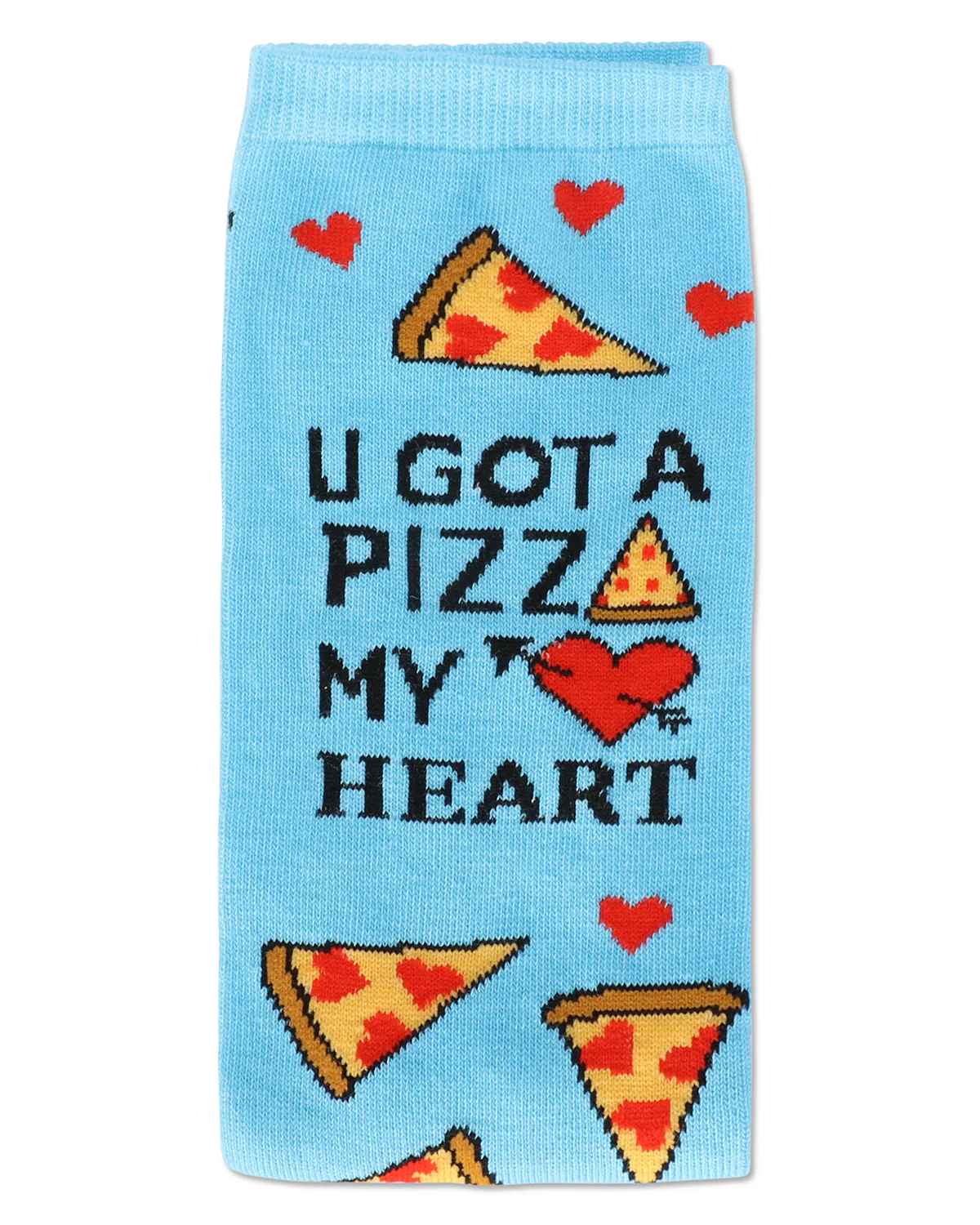 These socks are a little slice of heaven! Our U Gotta Pizza My Heart Greeting Card Socks are the perfect present for someone who loves the delicious dish, but loves you even more! Surprise a friend or special someone with this unique socks and card set; perfect for gifting and made even more thoughtful with a personalized message from you to them. These fun novelty crews come in blue grotto and feature a thick knit with yummy cheese slices and red hearts as toppings. Talk about a tasty treat!