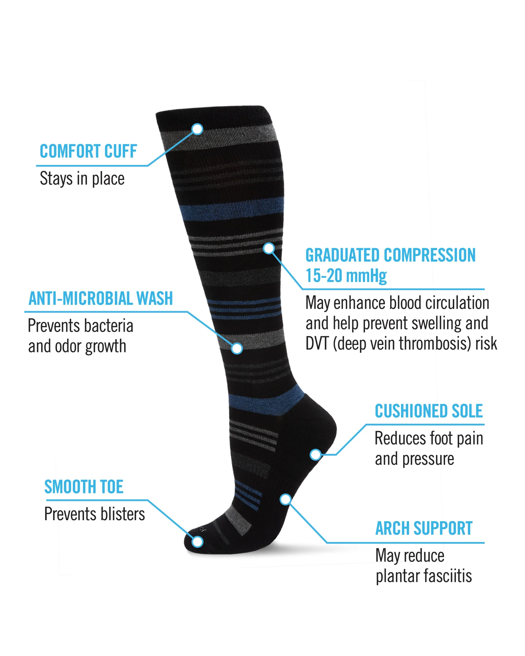 - 15-20 mmHg of graduated compression that can provide relief for tired, sore legs