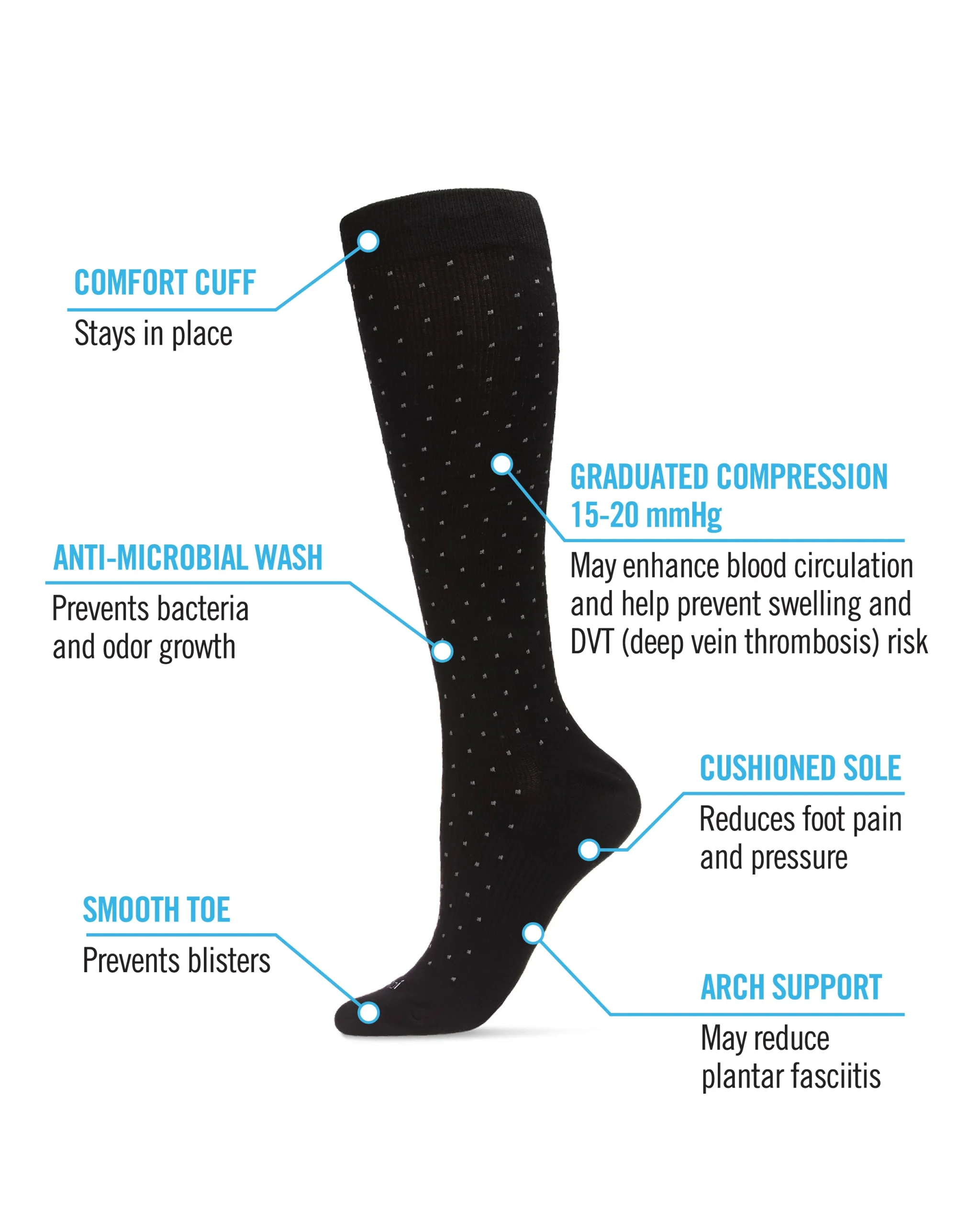 For an athletic sock with some European style pizzazz, choose our Unisex Swiss Dot Cotton Blend 15-20mmHg Graduated Compression Socks and step into the future. Our cotton blend dotted knee-high sock utilizes firm compression for when you need respite and repair the most. Our graduated compression technology provides relief from swelling and encourages blood circulation. Improve your performance while promoting your health with WellFit.