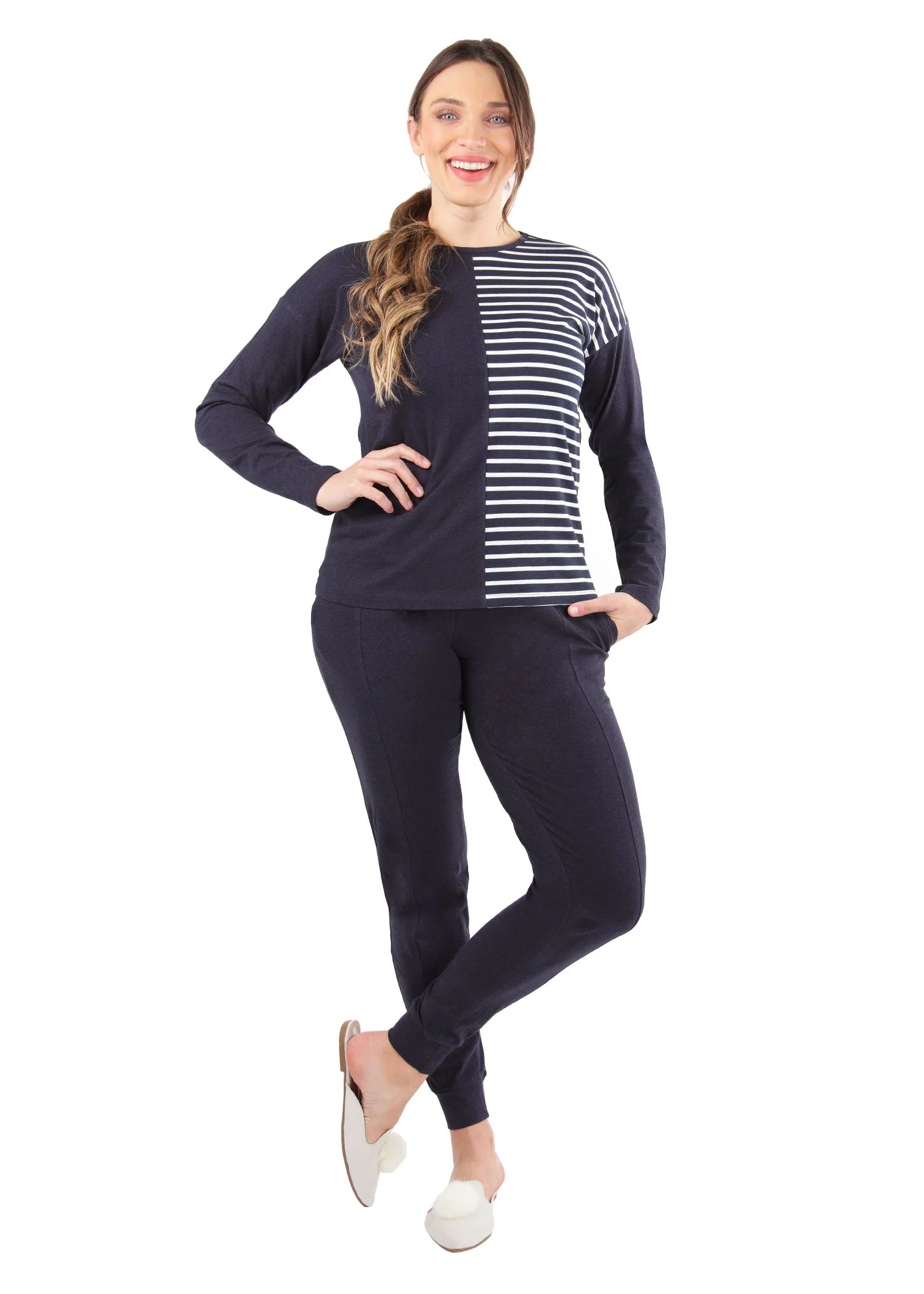 Can’t decide on stripes or solids? Our 100% Cotton Breton Stripe Two Tone Pajama Set can help. This unique pajama set offers a touch of coastal style with a panel of navy and white nautical stripes on the nightshirt, disappearing into a sea of blue modal with matching bottoms that will have you floating into dreamland.