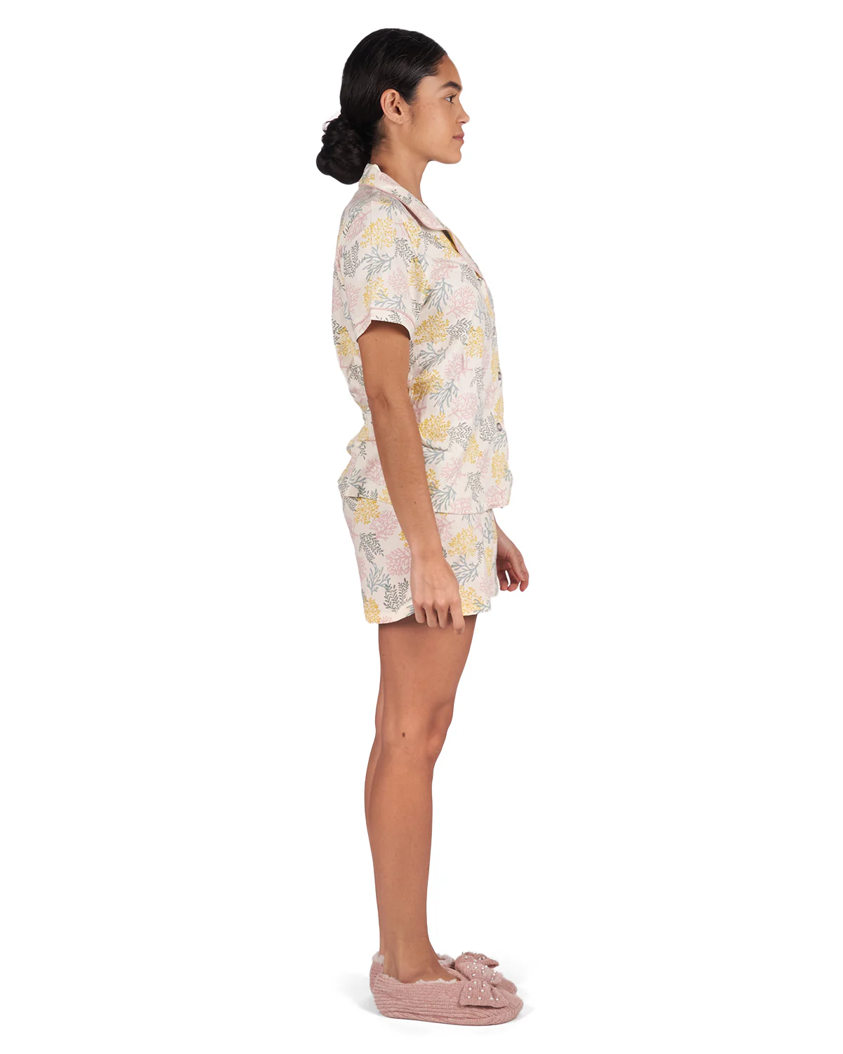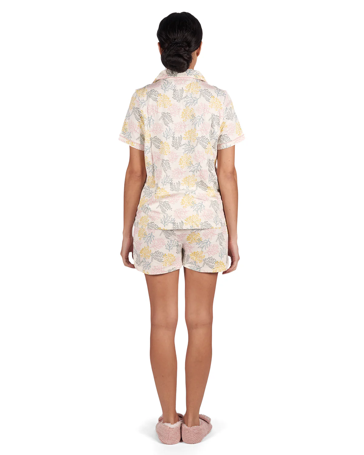 Give up sleepless nights, and get better zzz’s in our Coral Reef Notch Collar PJ Set. Ultra soft cotton and rayon yarns are woven together to create a timeless silhouette. Featuring a silky smooth and breathable button front top with short sleeves and a single chest pocket, and short bottoms that are flattering, lightweight, and finished with a classic contrast piping trim detail. Designed with an adjustable and stretchy drawstring waistband that’s ideal for napping, relaxing, and everything in between. Built to last, enhanced knit prevents pilling so you can enjoy these from season to season. They come in a coordinating drawstring bag for easy gifting and transportation.