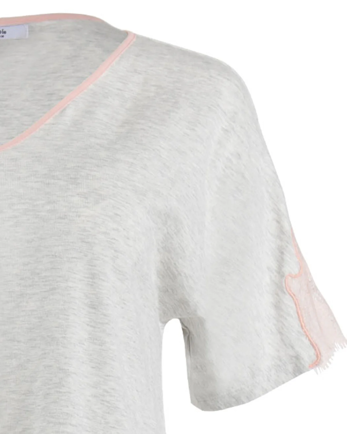 Warmer nights mean lighter pajamas. That’s why we’ve designed our Cotton Blend Lace Trim Short Sleeve Top & Pant Sleep Set with seasonal comfort in mind. Breezy heather gray fabric is perfectly complemented by textured trim around a v-neck opening, while your arms stay airy with intricate lace sleeves that form floral patterns in peachy pink. Heather gray pajama bottoms complete the look to bring you a night of pure comfort.