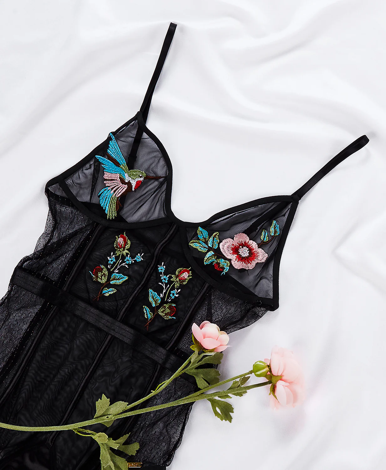 Women’s Embroidered Mesh Hummingbird Floral Bodysuit