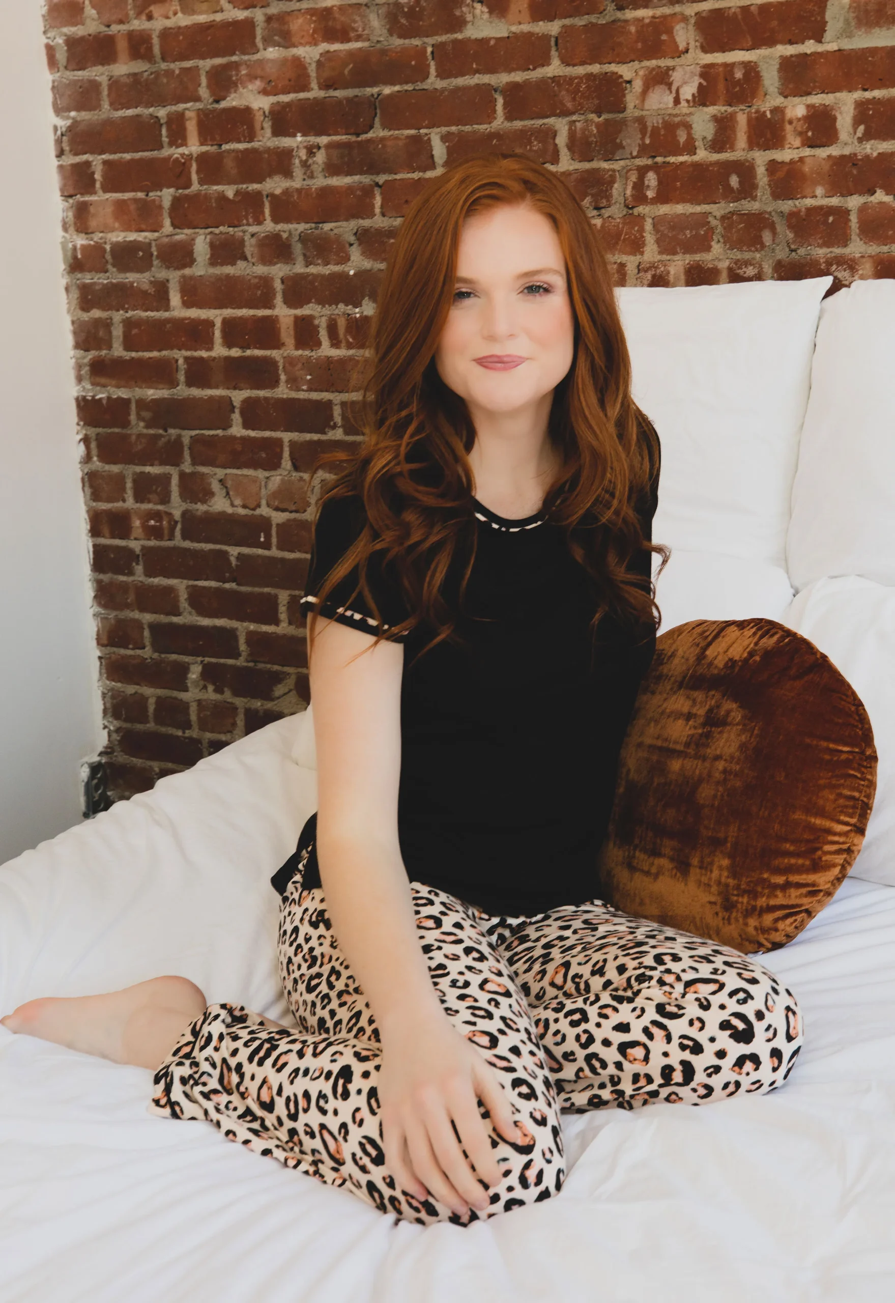 • Cozy black t-shirt and long leopard print pajama bottoms