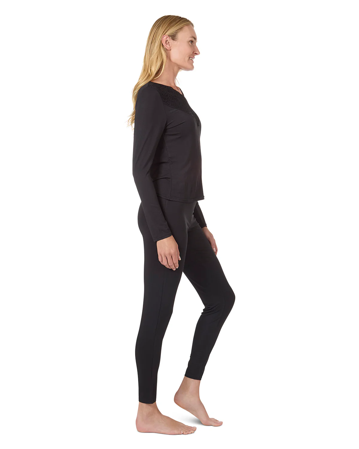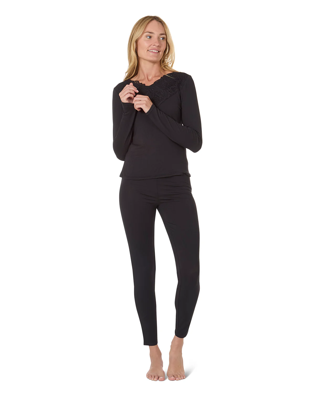 An ultra-soft modal sleep set will make mornings a little brighter. Features a long sleeve top with an embellished lace v-neckline and tapered bottoms with a flattering drape Relaxed Fit Lightweight Fabrication Non-Binding Waistband Comfort Stretch Knit
