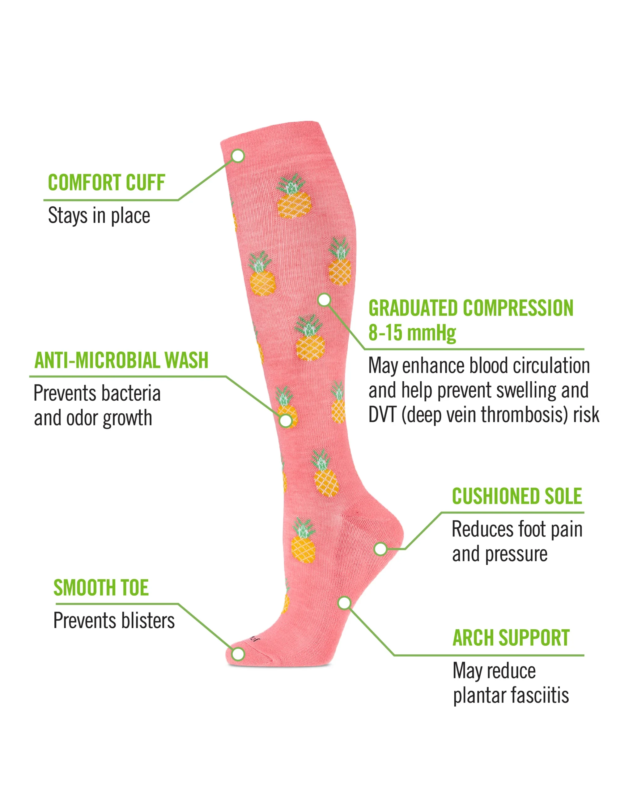 Energize your step in our Pineapple Paradise Bamboo Blend Compression Socks. Created with moderate and graduated compression, so they’re not too tight, but just snug enough to give you that extra support you need. Compression socks are great for busy travelers, active athletes, and long days at the office. Featuring a comfort cuff to provide smooth support and a non-slip fit, with anti-microbial properties that fight against foot odor. The smooth and seamless toe prevents irritation, and the added cushioned sole reduces pain and pressure so you can take a load off. The stretchy knit nylon feels weightless and will keep you cool and comfortable for all day wear. Healthy blood flow and swelling reduction might not be all that glamorous, but you might as well do it in style!