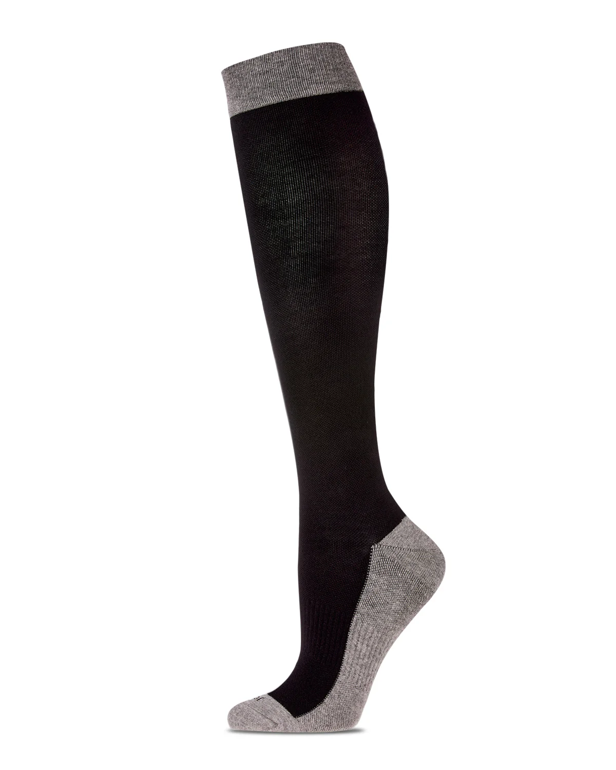 Energize your step in our Two-Tone Contrast Bamboo Blend Compression Socks. Created with moderate and graduated compression, so they’re not too tight, but just snug enough to give you that extra support you need. Compression socks are great for busy travelers, active athletes, and long days at the office. Featuring a comfort cuff to provide smooth support and a non-slip fit, with anti-microbial properties that fight against foot odor. The smooth and seamless toe prevents irritation, and the added cushioned sole reduces pain and pressure so you can take a load off. The stretchy knit nylon feels weightless and will keep you cool and comfortable for all day wear. Healthy blood flow and swelling reduction might not be all that glamorous, but you might as well do it in style!